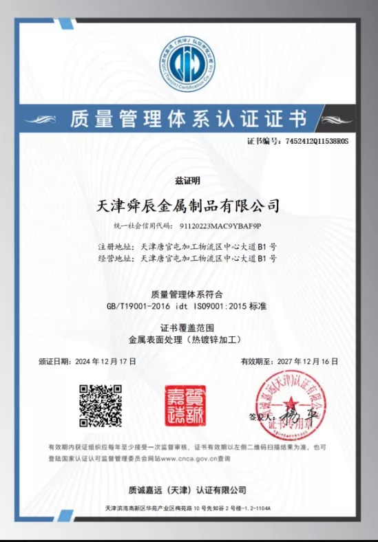 Q235B : Limite d'élasticité ≥ 235MPa, résistance à la traction 375-500MPa, allongement ≥ 26 % ; 2. Q355B : Limite d'élasticité ≥ 355MPa, résistance à la traction 470-630MPa, allongement ≥ 21 % (les performances restent inchangées après la galvanisation à chaud).
