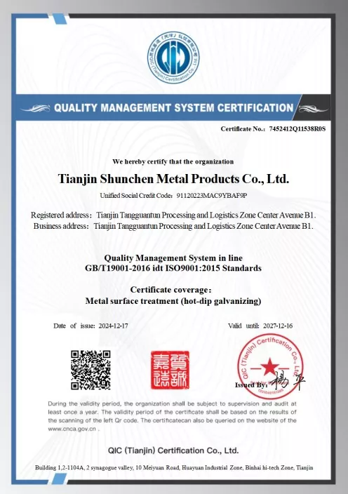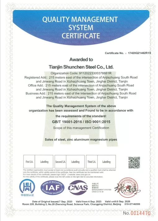 Normes : GB/T 3091-2015 « Tubes en acier soudés pour le transport de fluides à basse pression », GB/T 13912-2020 « Tubes en acier galvanisés à chaud ». Le produit a passé avec succès des tests tiers et dispose d'un rapport de test.