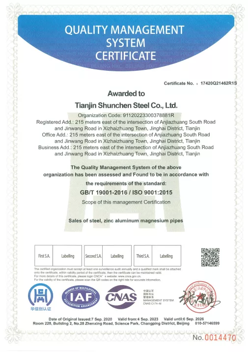 Nos tuyaux ronds galvanisés sont disponibles dans une large gamme de spécifications, avec 236 tailles différentes pour répondre à divers besoins. Nos produits sont certifiés ISO9001, détenant les certifications système ISO 9000, 3A et CE de l'UE. Nous fournissons également des rapports sur les matériaux, des certificats de test d'épaisseur de revêtement de zinc et des rapports d'inspection de qualité par des tiers. Choisir les tuyaux ronds galvanisés de Shunchun vous offre non seulement des services d'achat à guichet unique, mais également une assistance après-vente 24h/24 et 7j/7 et un suivi en temps réel à 18 points clés, rendant votre approvisionnement plus fiable et sans souci.
