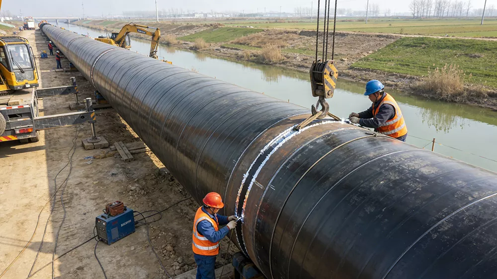 Application du produit : Sélectionnez le matériau Q345B pour les tuyaux en spirale de grand diamètre, avec un diamètre extérieur de 2020 mm et une épaisseur de paroi de 18 mm. Le processus anticorrosion de qualité eau potable IPN8710 est adopté pour garantir l’absence de pollution secondaire de l’eau potable. Des matériaux de tuyaux personnalisés de 18 m de longueur standard sont fournis, totalisant plus de 5 000 tonnes, pour la pose du pipeline principal à travers les rivières et dans les terres agricoles.Scène :