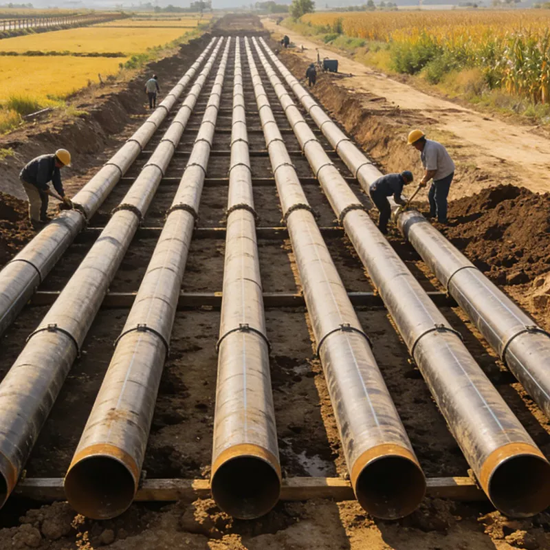 Scénarios applicables : projets de détournement d'eau à grande échelle, projets de transfert d'eau, projets de contrôle des inondations et de drainage, canalisations principales pour l'irrigation des terres agricoles, projets d'approvisionnement en eau potable, projets d'approvisionnement en eau insulaire, etc. Les principales exigences sont une capacité de débit élevée, une résistance à la corrosion et une résistance à la pression de l'eau. Ils peuvent être adaptés à des environnements complexes tels que les lits des rivières, les terres affectées par le sel, etc. Ils peuvent résister efficacement à l'érosion hydrique et à l'affaissement géologique, assurant le transport stable des ressources en eau et garantissant le fonctionnement sûr des projets de conservation de l'eau. Ils jouent un rôle de soutien important dans les principaux projets nationaux de conservation de l'eau. Description de la scène : Sur le chantier de construction du projet de dérivation des eaux de Jinghai, des tuyaux en spirale de grand diamètre sont utilisés pour la pose des canalisations principales. Les canalisations traversent des rivières ou des terres agricoles, et les ouvriers effectuent un traitement d'étanchéité des interfaces. Sur le site du projet d'approvisionnement en eau de l'île, des tuyaux en spirale de grand diamètre dotés de la technologie anticorrosion 3PE sont utilisés pour résister à l'érosion de l'eau de mer et réaliser l'interconnexion des ressources en eau entre l'île et le continent.