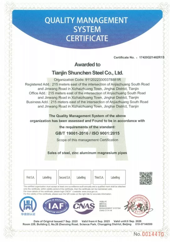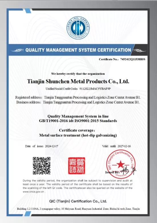La section Steel U de Shunchen Industrial a obtenu la certification de qualité ISO9001, répondant aux normes nationales. Nous fournissons des rapports d'essais de matériaux tiers et des certificats d'épaisseur de galvanisation. Notre production utilise des lignes de production avancées, soumises à 12 étapes de processus rigoureuses, renforcées par plus de 20 ans d'expertise en production. Nous maintenons depuis 12 ans un historique de zéro violation de contrat et de zéro incident de qualité annuel. Pendant le processus de production, trois traitements de passivation sont appliqués pour améliorer la résistance aux anti-alcalis des produits galvanisés. Chaque produit fini subit un séchage, une inspection et une finition avant d'être emballé et expédié. L'entreprise est titulaire des certifications ISO 9000, système 3A et de la certification CE de l'UE. Grâce à nos 12 étapes de processus et à un mécanisme d'inspection complet à trois niveaux, nous avons atteint zéro incident annuel de qualité et de sécurité et maintenu un record de 12 ans de zéro violation de contrat.
